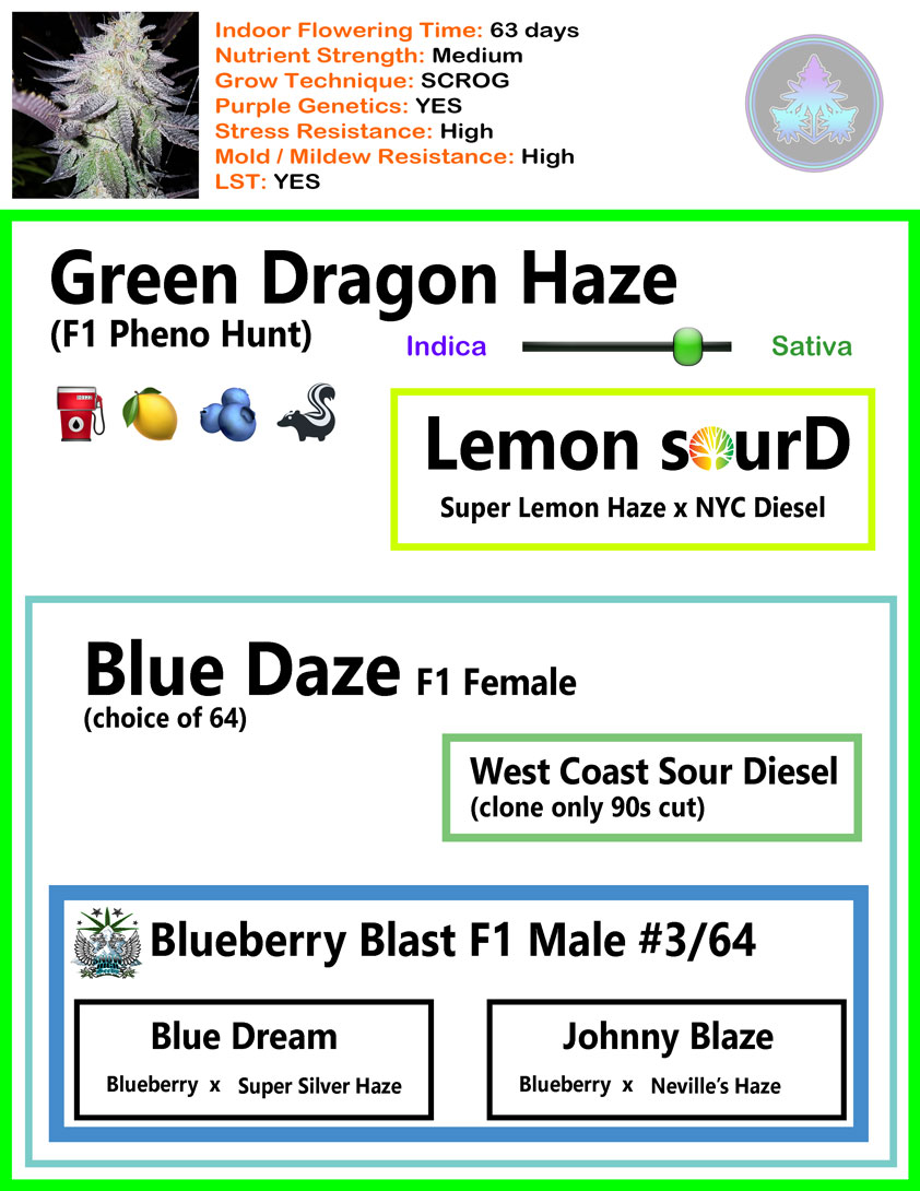 This Mostly Sativa Powerhouse combines FOUR Legendary Bloodlines in a Poly-Hybrid expression sure to impress even the pickiest Sativa connessiour! Comprised of DJ’s Blueberry, Super Silver Haze, Neville’s Haze, West Coast Sour Diesel, East Coast Sour Diesel, and Super Lemon Haze, our in-house EXCLUSIVE “Green Dragon Haze” boasts terpene profiles sure to knock your socks off and leave you begging for another sniff.... Great for Daytime or Evening use, the Sativa Dominance adds for a delightful mood with a hint of mellow anxiety relief. This strain will induce creativity and giggly behavior, so it is best not suited for insomnia patients. Odor Control Recommended.